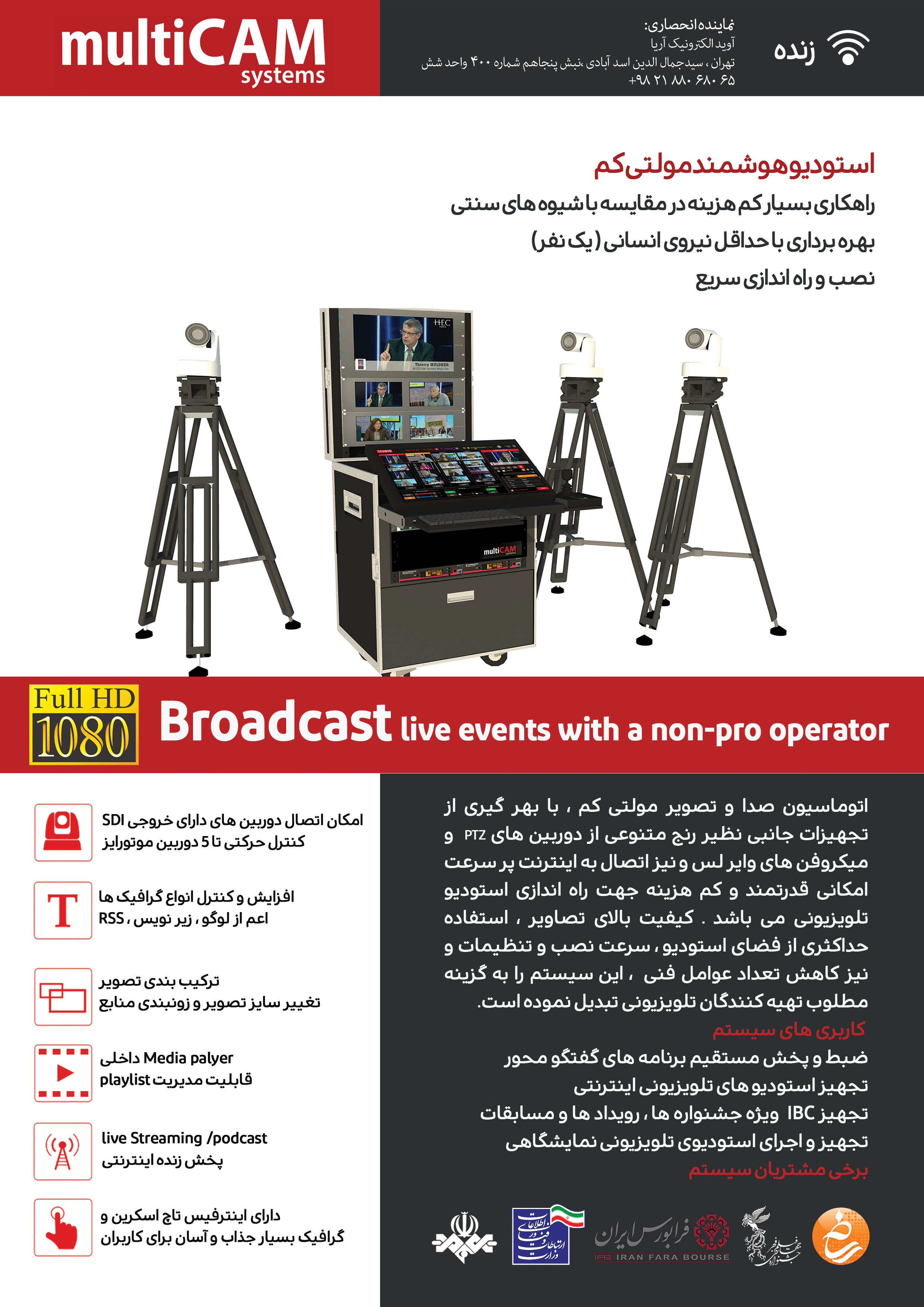 گروه مهندسی آوید در راستای تکمیل خدمات فنی ، مهندسی خود مبادرت به راه اندازی واحدهای سیار تلویزیونی اینترنتی با استفاده از تکنولوژی هوشمند studio ساخت Multicam نموده که این تجهیزات مورد استقبال کارفرمایان محترم در اقصی نقاط ایران گردیده است.