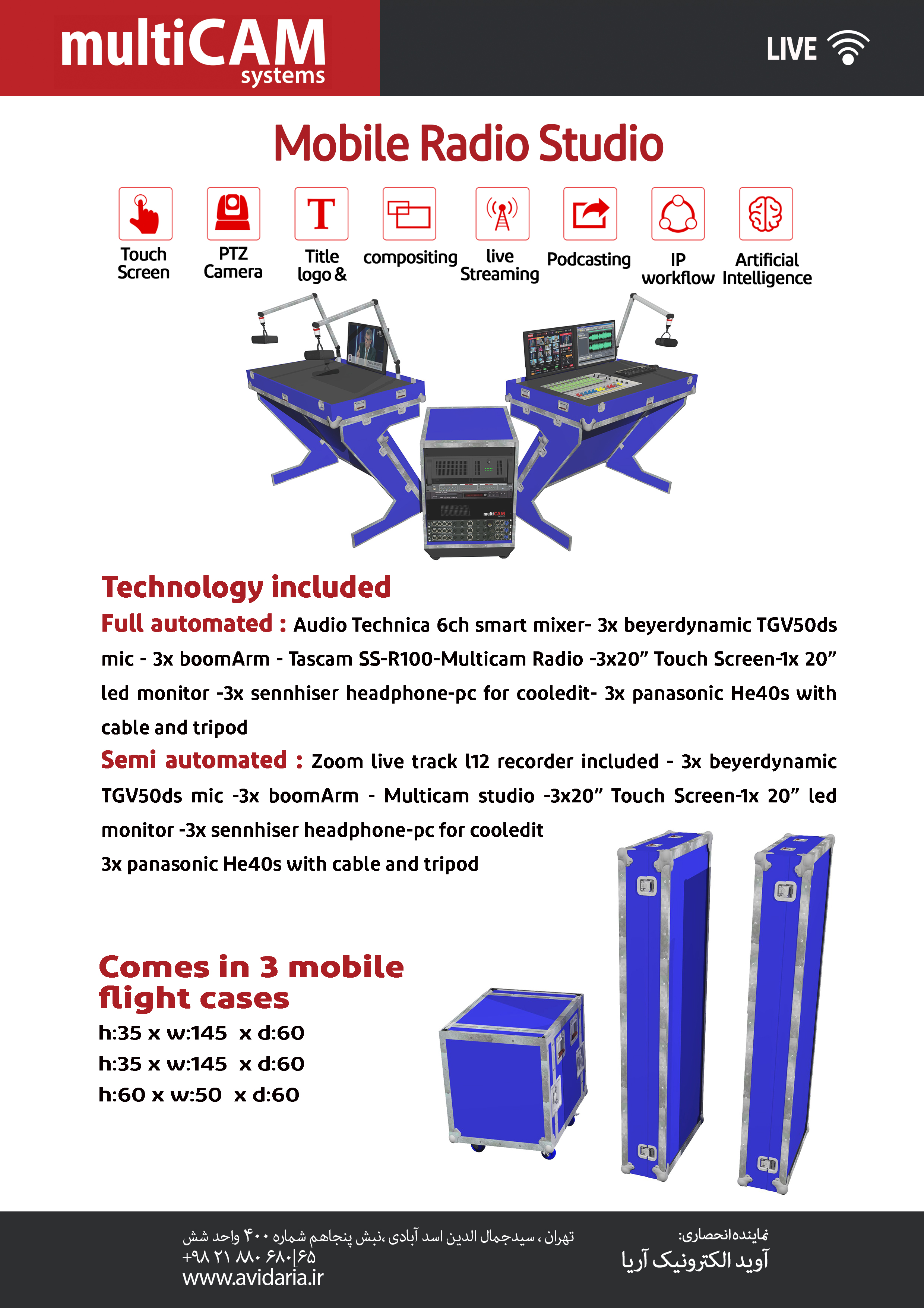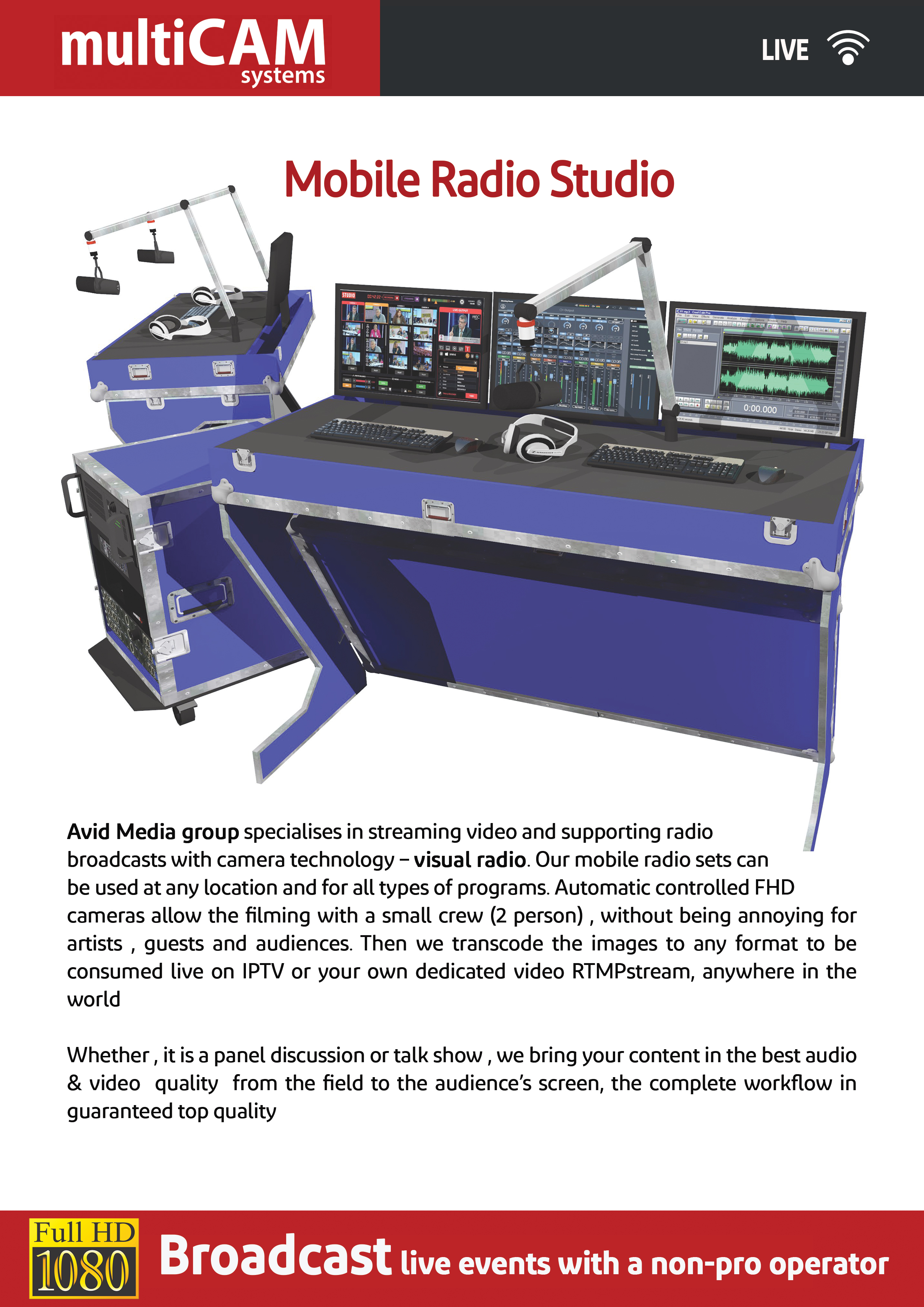 گروه آوید به عنوان تنها مجری رادیو تصویری در ایران پس از تجربه موفق راه اندازی و تست این سیستم در استودیو شماره یک رادیو ، آمادگی انجام پروژه های مشابه در اقصی نقاط ایران را دارد . بدین منظور تجهیزات متنوعی فراهم گردیده اما قلب این سیستم از محصولات کمپانی فرانسوی MULTICAM انتخاب شده است . این شرکت پس از تجربه های موفق در زمینه رادیو تصویری ،موفق گردیده بیش از سه سال به عنوان رادیو IBC به ایفای نقش بپردازد .